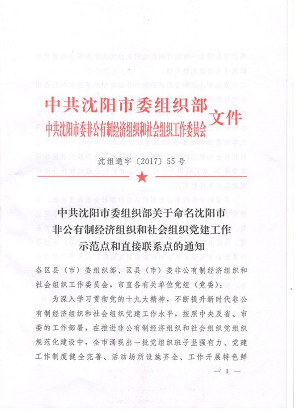 日前,从中共沈阳市委组织部、中共沈阳市委非公有制经济组织和社会组织工作委员会联合下的《中共沈阳市委组织部关于命名沈阳市非公有制经济组织和社会组织党建工作示范点和直接联系点的通知》获悉,我校被命名为沈阳...