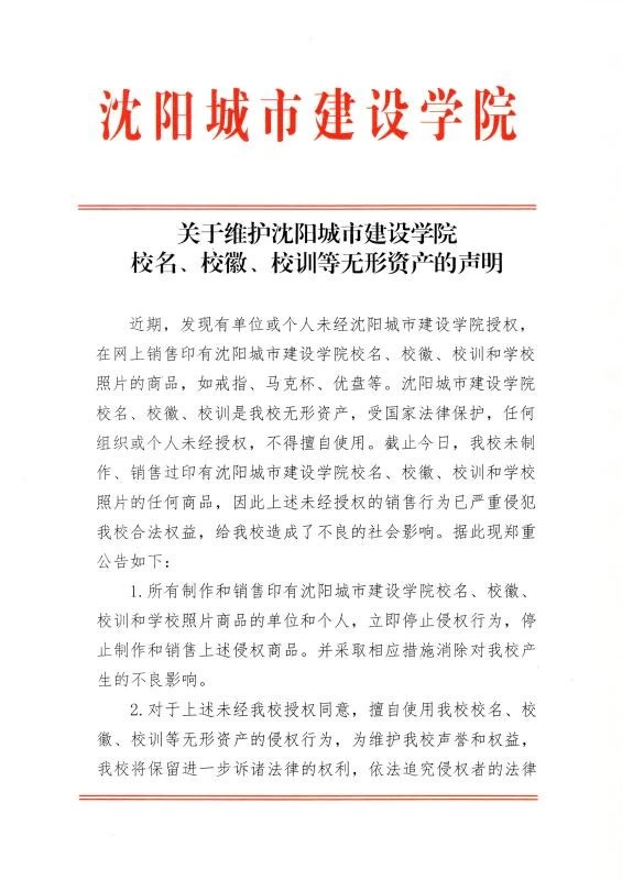 关于维护沈阳城市建设学院校名、校徽、校训等无形资产声明