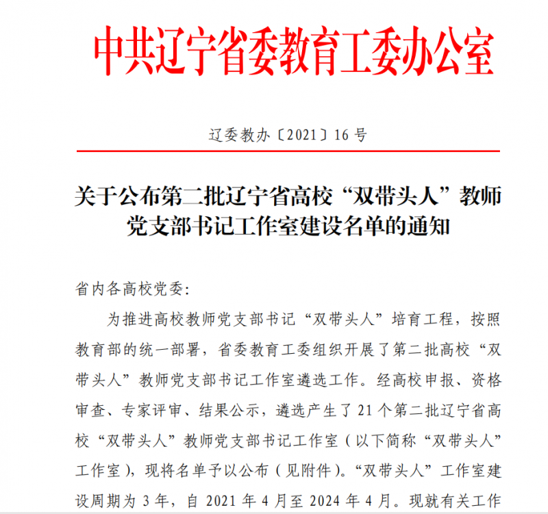我校入选第二批辽宁省高校“双带头人”教师党支部书记工作室