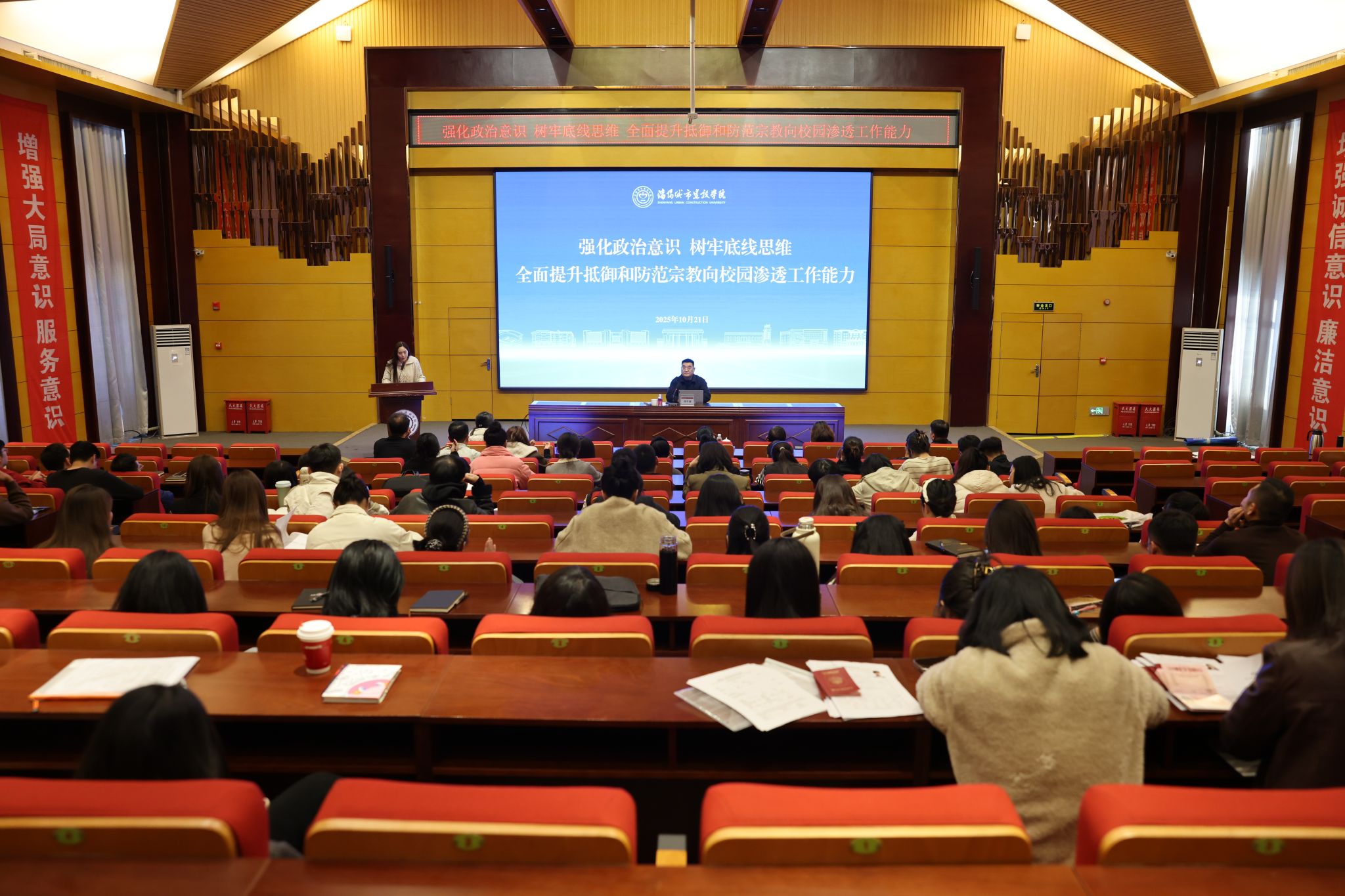 为深入学习贯彻习近平总书记关于宗教工作的重要论述,全面贯彻中央统战工作会议精神,不断提升我校师生抵御和防范宗教渗透的能力,10月22日下午,学校党委邀请沈阳化工大学党委常委、统战部部长,中国统一战线理论研究会基层统战工作理论辽宁研究基地副秘书长肖于波开展专题讲座。学校副校长李厚艳在讲座开场前与肖于波部长进行了会面交流。各相关单位、各党总支、学工部、团委等部门负责同志、马克思主义学院教师代表、统战联络员队伍、...