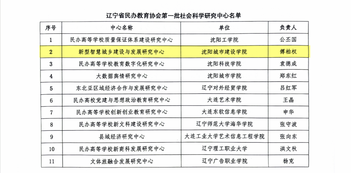 近日,我校由副校长傅柏权负责的“新型智慧城乡建设与发展研究中心”成功获批辽宁省民办教育协会第一批社会科学研究中心。