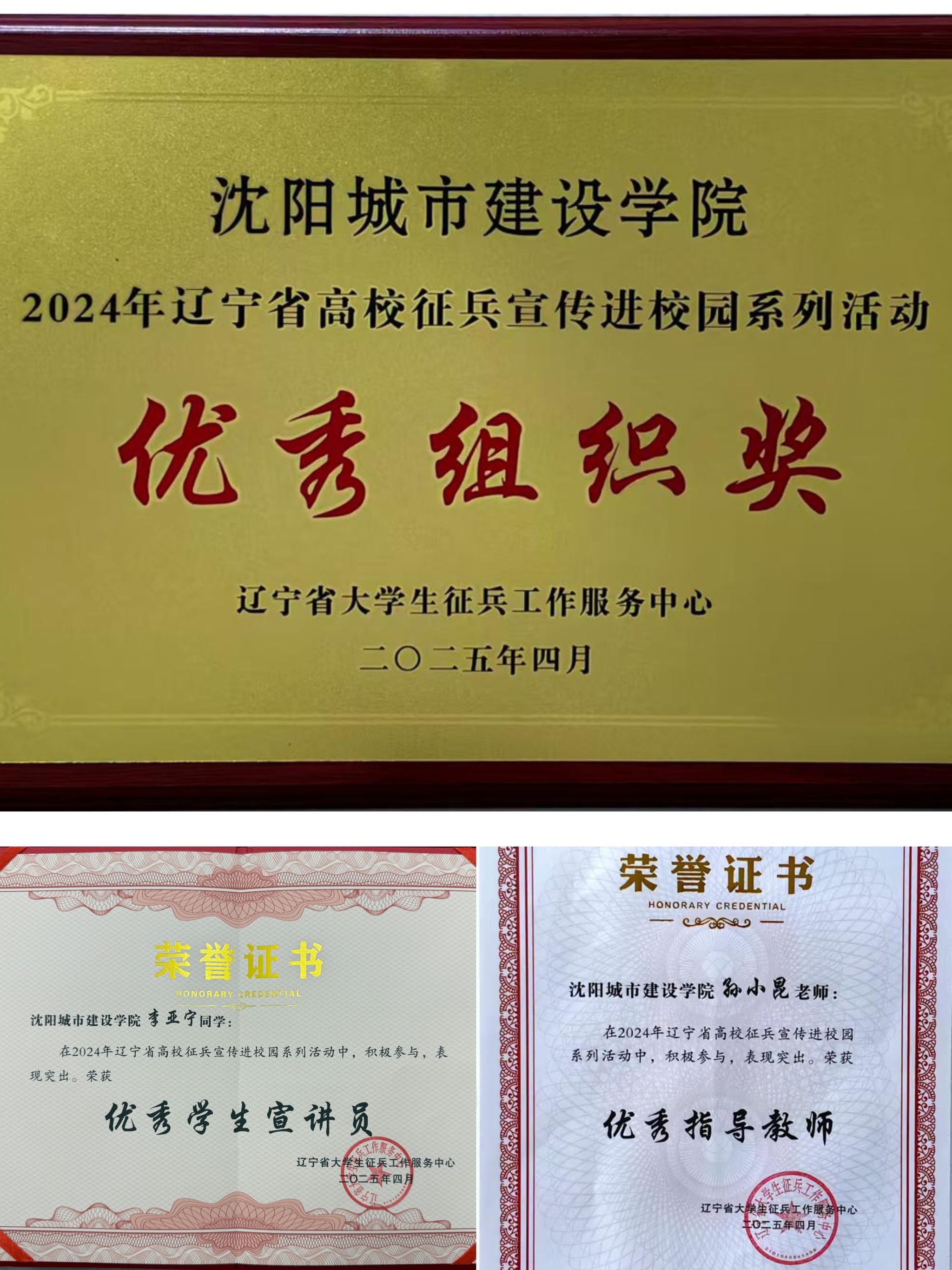 长期以来,学校高度重视征兵工作,不断向部队输送优秀青年。城建学子从校园走向军营,献身国防,贡献城建力量,多人多次受到部队嘉奖。学校连续九年超额完成征兵任务,多次被评为征兵工作先进单位,在2024年辽宁省高校征兵宣传进校园系列活动中荣获优秀组织奖。