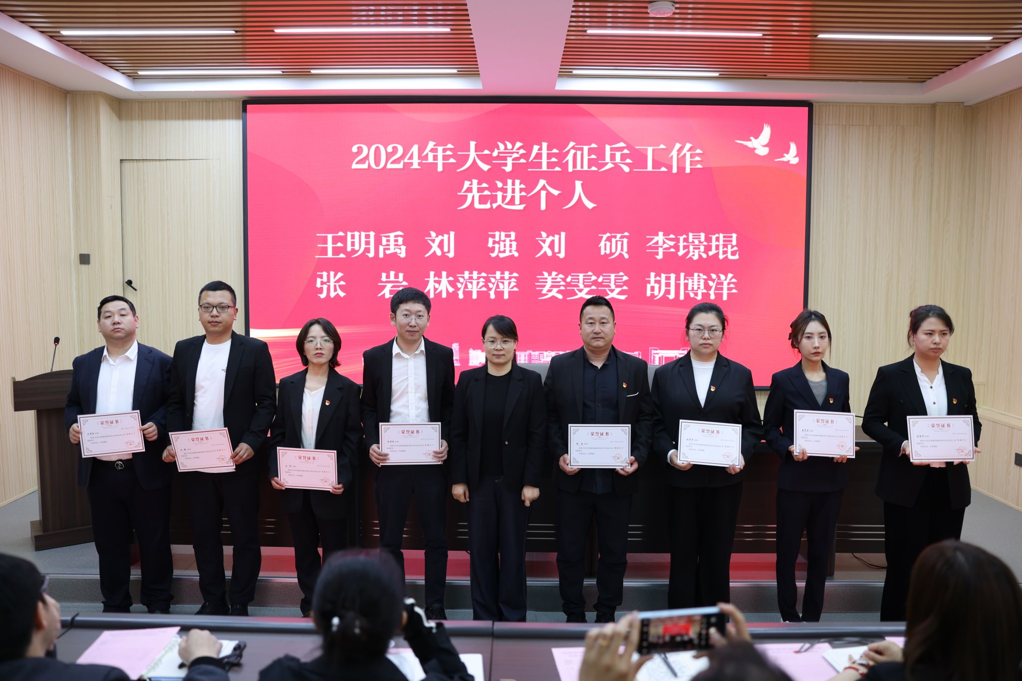 李丹宣读了《2024年大学生征兵工作先进单位、先进个人名单》。张晓雁、李厚艳依次为获奖单位和个人颁奖。