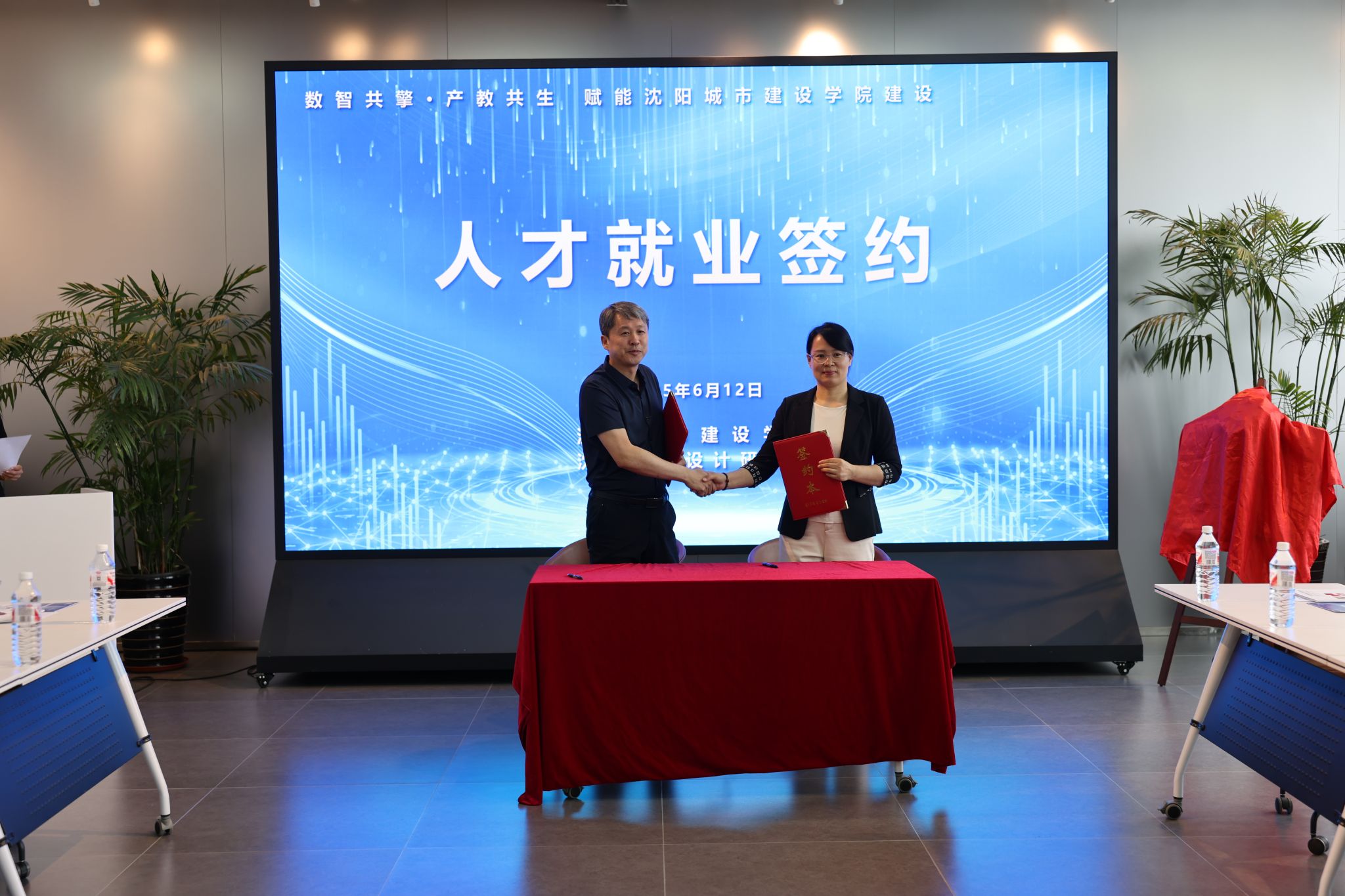 李厚艳与沈阳创新设计研究院人事部总监梁俏代表双方签署人才就业协议。