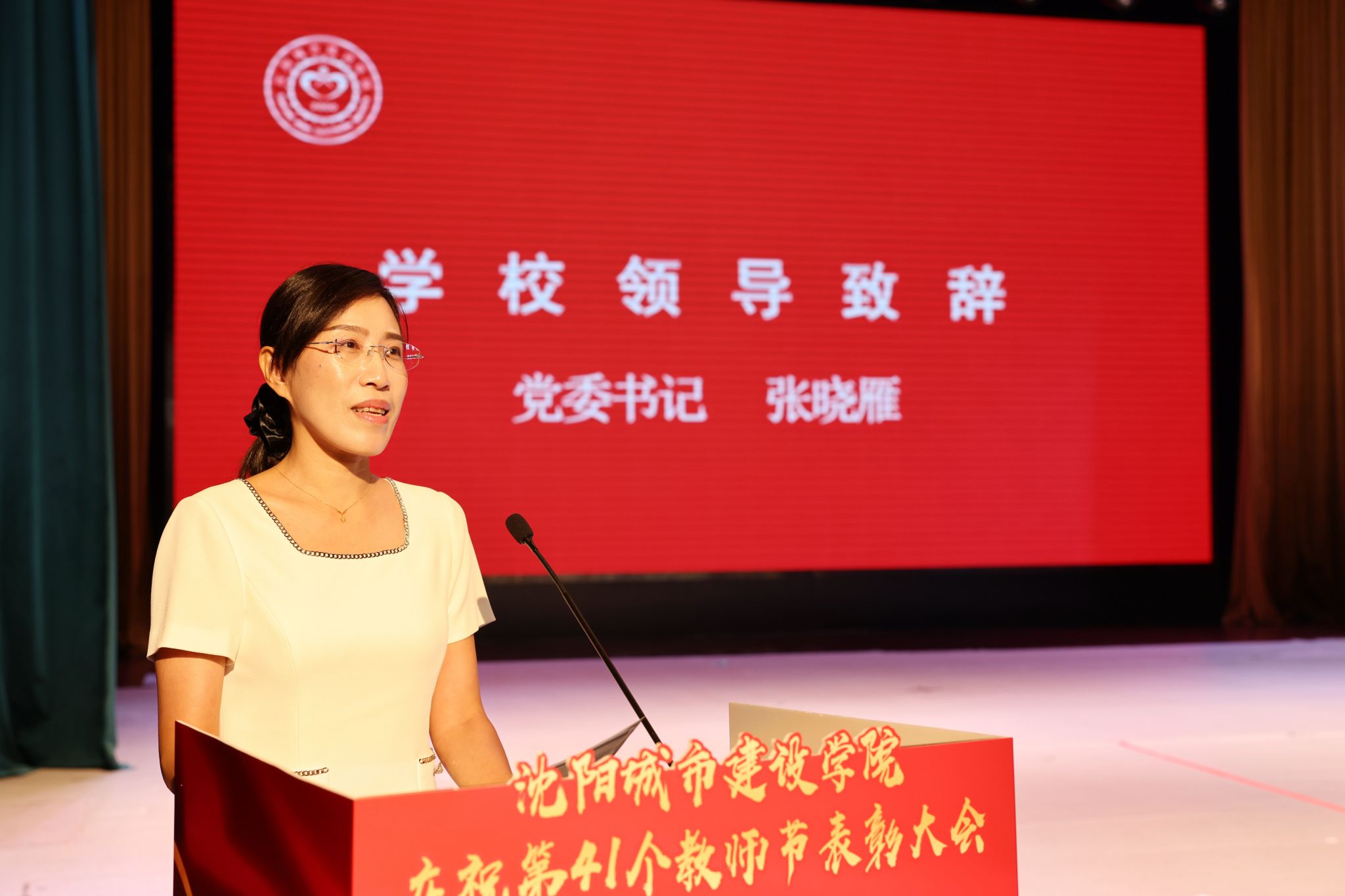 党委书记张晓雁以《躬耕教坛守初心,强校有我担使命》为题致辞。她代表学校领导班子向辛勤耕耘在各个岗位的全体教职员工,致以最热烈的节日祝贺和最诚挚的问候;向受到表彰的先进典型,表示最衷心的祝贺。