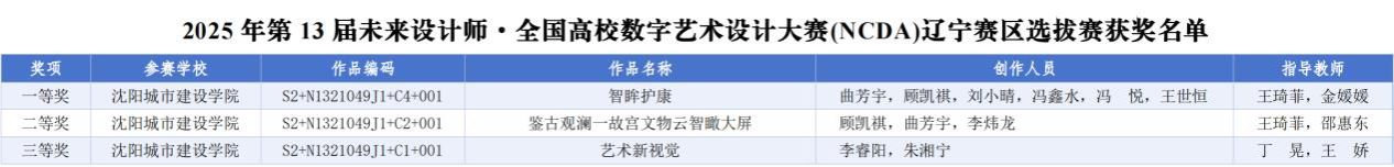 近日,2025年第13届未来设计师·全国高校数字艺术设计大赛(NCDA)辽宁赛区选拔赛圆满落幕。由我校信息与控制工程学院教师王琦菲、金媛媛指导,学生曲芳宇、顾凯祺等6名学生组成的参赛团队,凭借富有创意的作品构思、精湛的数字艺术设计能力和高效的团队协作,在众多参赛作品中脱颖而出,其作品《智眸护康》荣获辽宁赛区一等奖。另由信息与控制工程学院教师王琦菲、邵惠东、丁晃、王娇指导,学生曲芳宇、李睿阳等5名学生完成的两个作品分获辽宁赛区二等奖和三等奖。此次参赛是我校师生首次参赛,便一举拿下多项荣誉,充分彰显了学校在数字艺术领域的教学实力以及师生出色的创意创新能力与专业设计水准。
