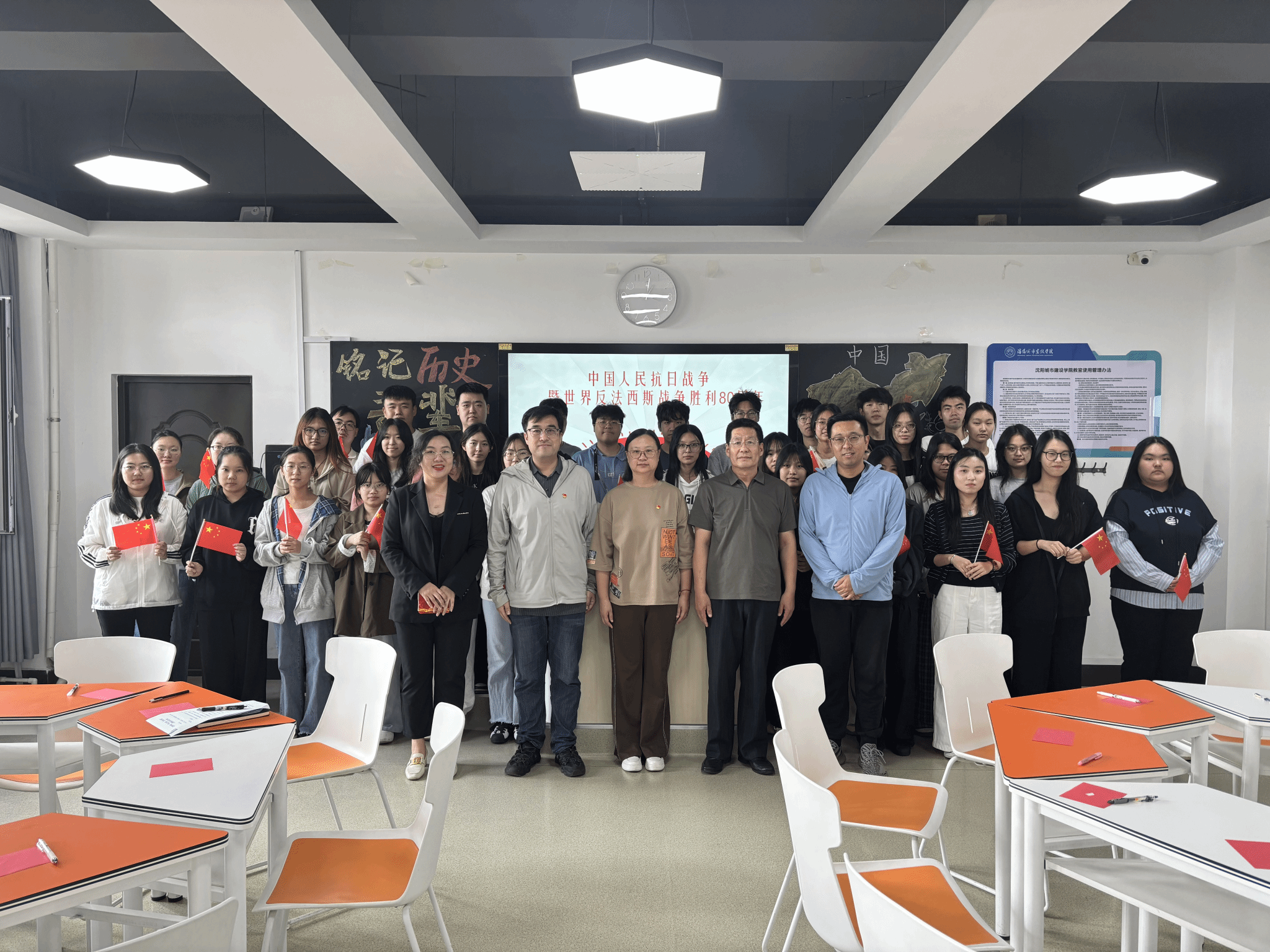 副校长吴继君、傅柏权共同参加艺术与传媒学院主题班会。在悠扬的《松花江上》旋律中,辅导员张雪煜以伟大抗战精神的自强底色为指引,思政课教师李媛在线指导,线上线下共同号召学生提笔写下爱国志向,形成“爱国承诺墙”,成为全体学生铭记历史、践行自强的可视化动力。