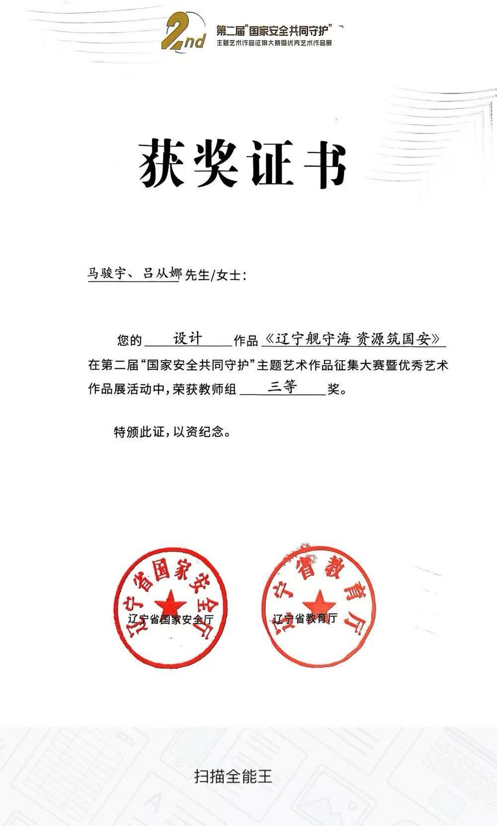 近日,由辽宁省教育厅、辽宁省国家安全厅联合主办,鲁迅美术学院承办的辽宁省第二届“国家安全 共同守护”主题艺术作品征集大赛暨优秀艺术作品展评选结果正式揭晓。我校马骏宇、吕从娜两位教师创作的设计作品《辽宁舰守海 资源筑国安》凭借深刻的主题内涵、鲜明的艺术特色,在众多参赛作品中脱颖而出,荣获教师组三等奖。