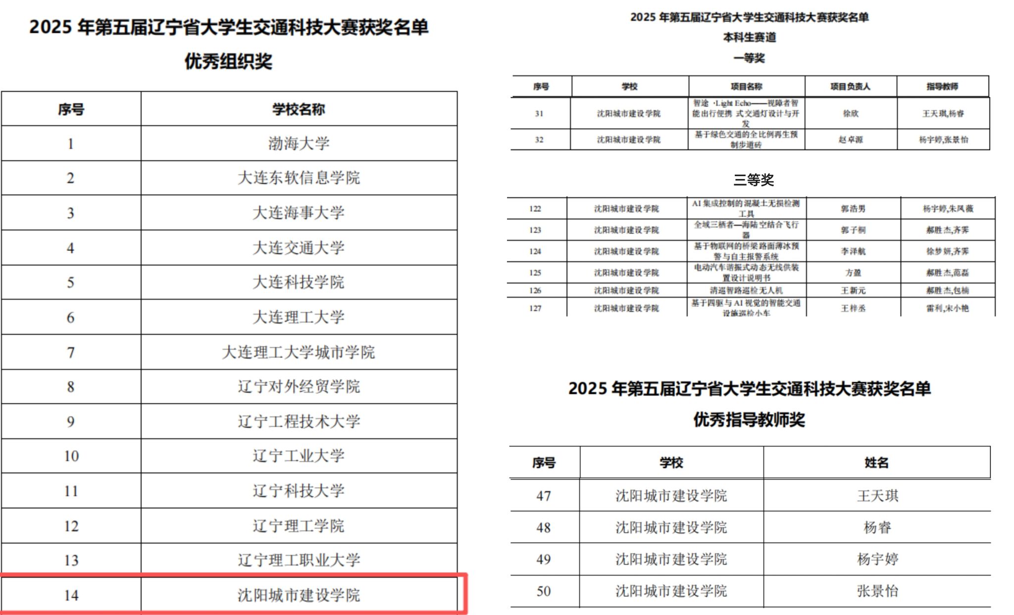 近日,由辽宁省教育厅主办的2025年第五届辽宁省大学生交通科技大赛在大连交通大学圆满落幕。我校由40名同学组成的8支队伍进入省赛。其中,2支队伍获得省级一等奖,6支队伍获得省级三等奖。另外,我校教师王天琪、杨宇婷、张景怡、杨睿均荣获优秀指导教师称号;学校获得优秀组织奖。