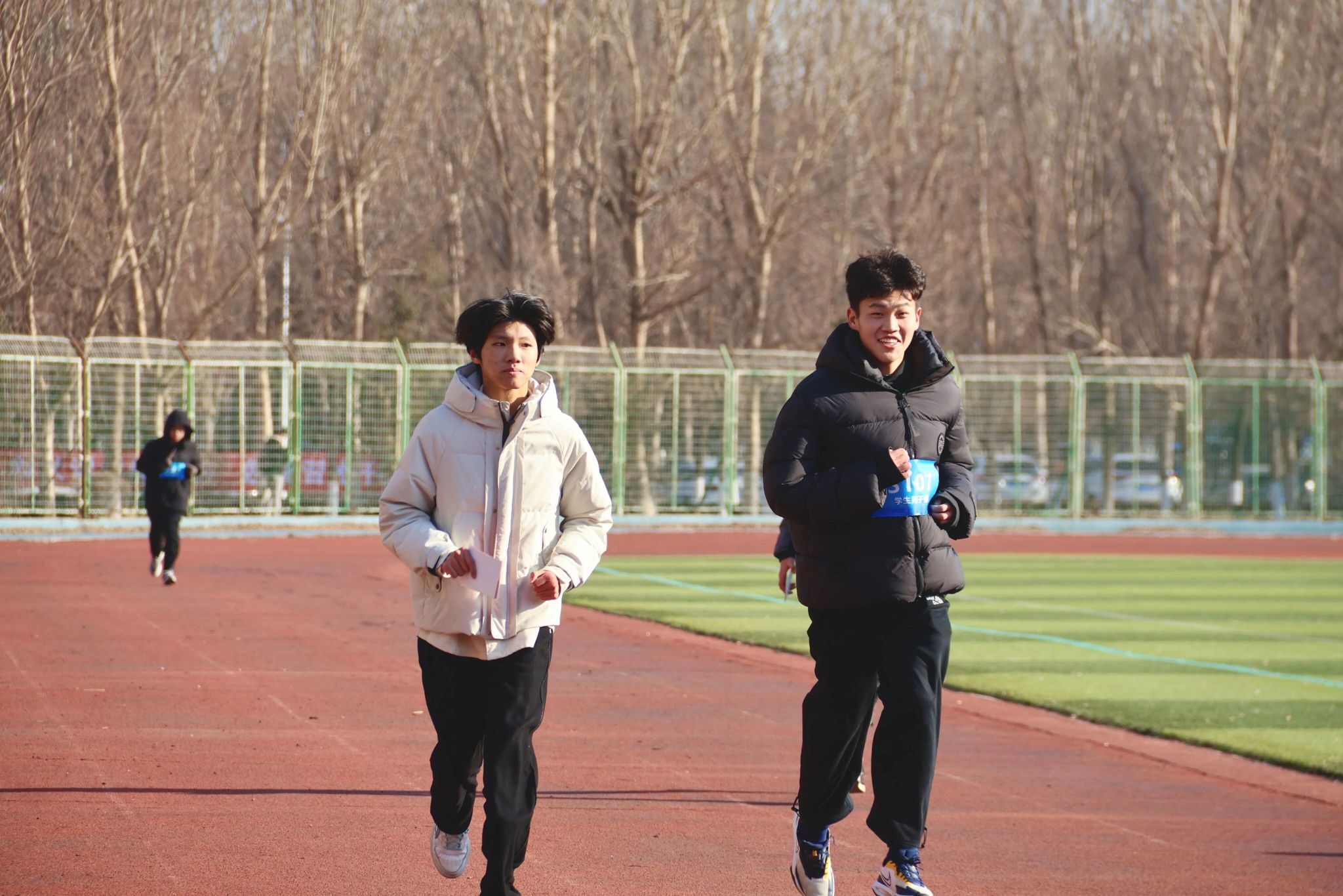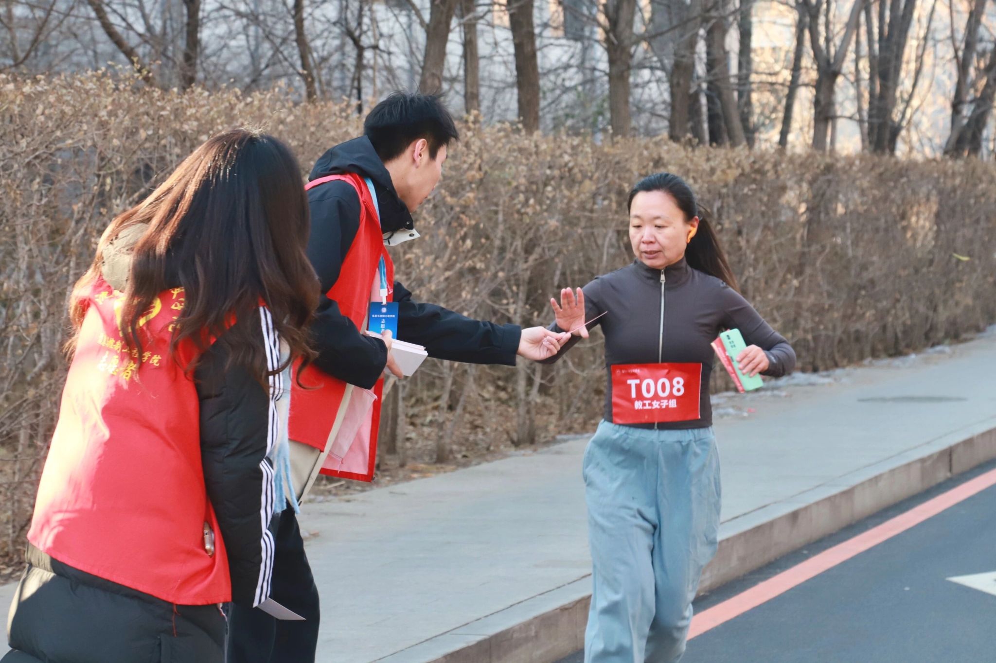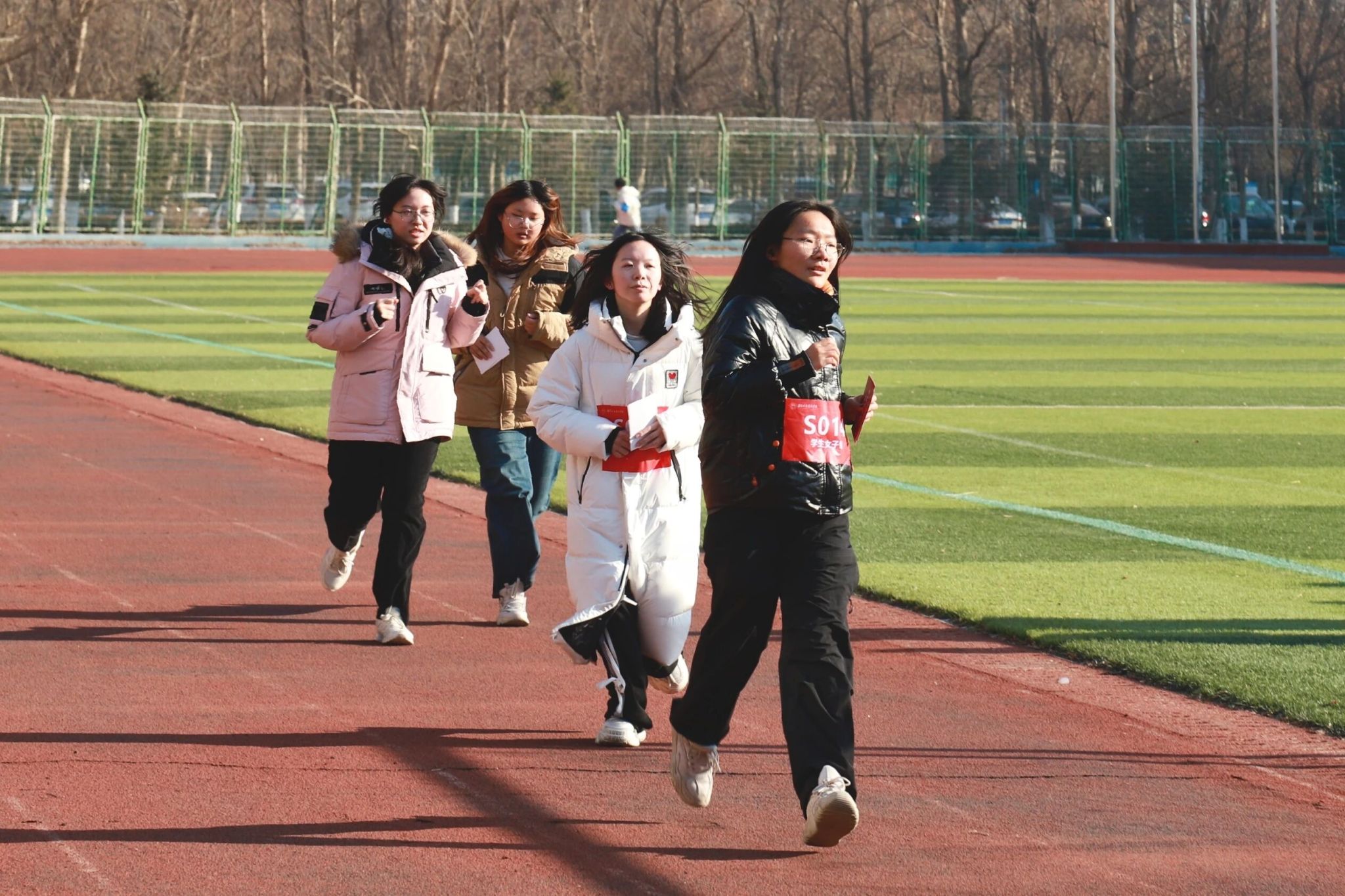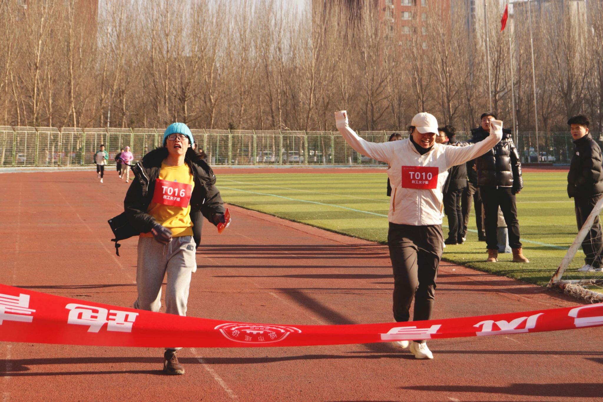 为保障比赛的公平公正,本次比赛实行教职工与学生分组竞技、两枪起跑制。随着发令枪先后响起,两组参赛选手们争相出发。师生按照学校前期拟定的路线,进行环校跑。