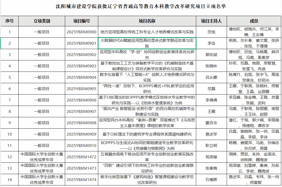 近日,辽宁省教育厅发布《关于确定2025年度辽宁省普通高等教育本科教学改革研究项目立项的通知》((辽教通〔2026〕67号),我校共有14项本科教育教学改革研究项目成功获批2025年度省级立项。其中一般项目11项、中国国际大学生创新大赛优秀成果专项项目3项,这一成果充分彰显了我校在教育教学改革领域深厚的研究积淀与扎实的实践成效。