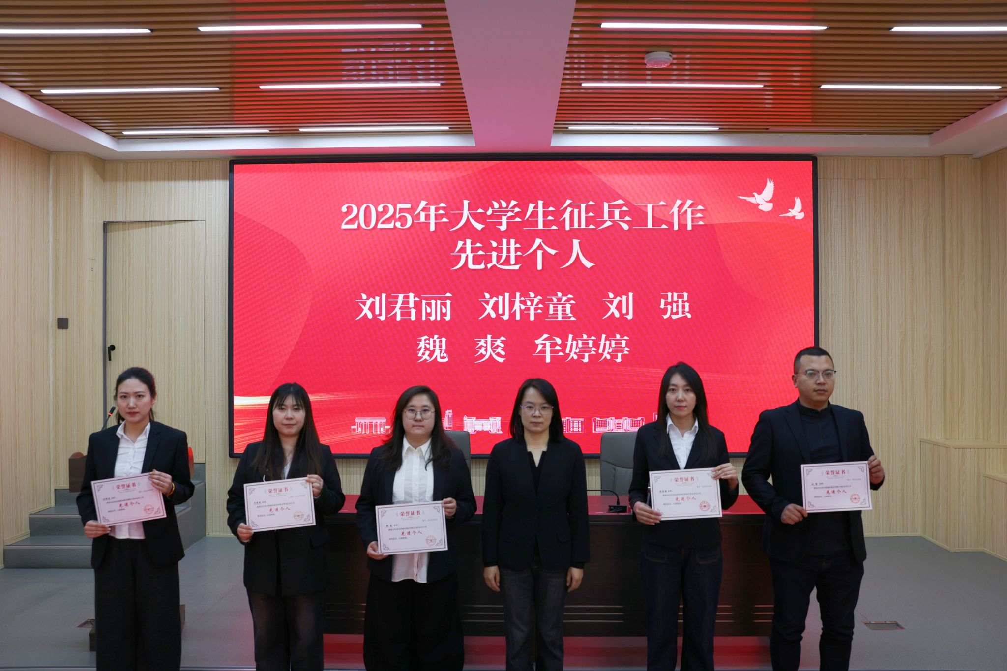 会议现场,张晓雁为“2025年大学生征兵工作先进单位”颁奖,李厚艳为“2025年大学生征兵工作先进个人”颁奖。