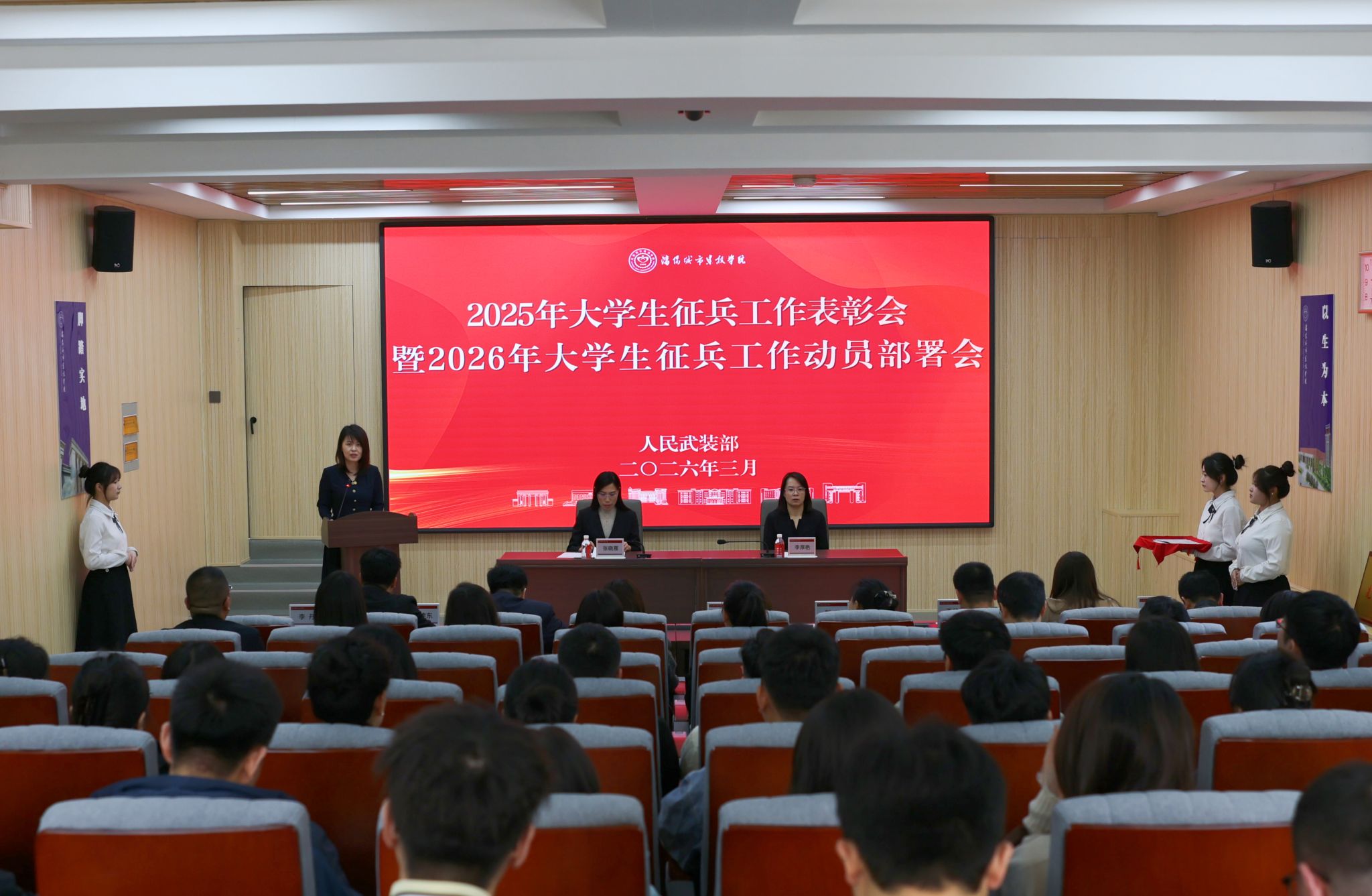 为全面总结学校2025年征兵工作,部署学校2026年征兵工作,3月31日,学校在守正楼101会议室召开2025年大学生征兵工作表彰会暨2026年大学生征兵工作动员部署会,学校党委书记张晓雁,副校长、人民武装部部长李厚艳出席会议。