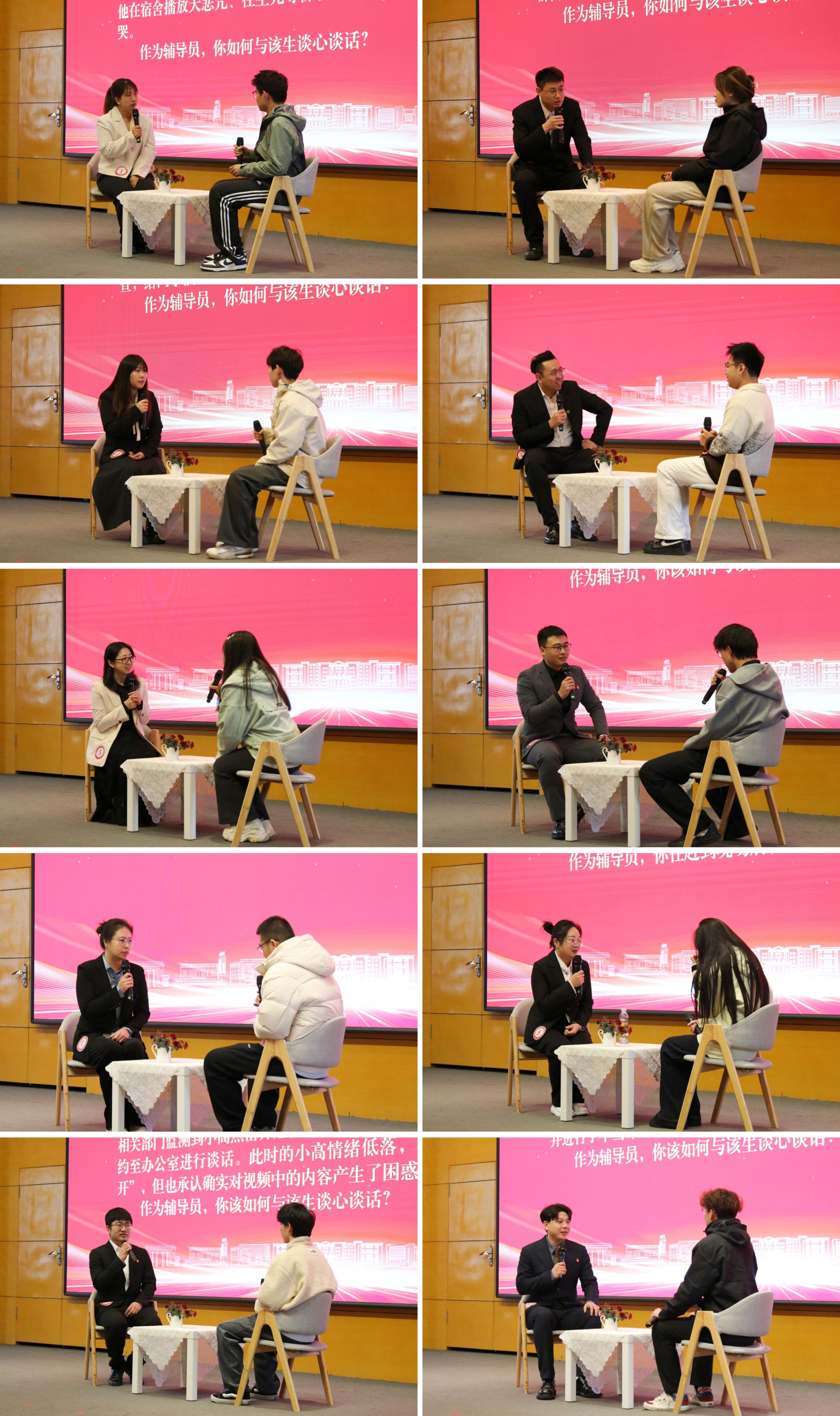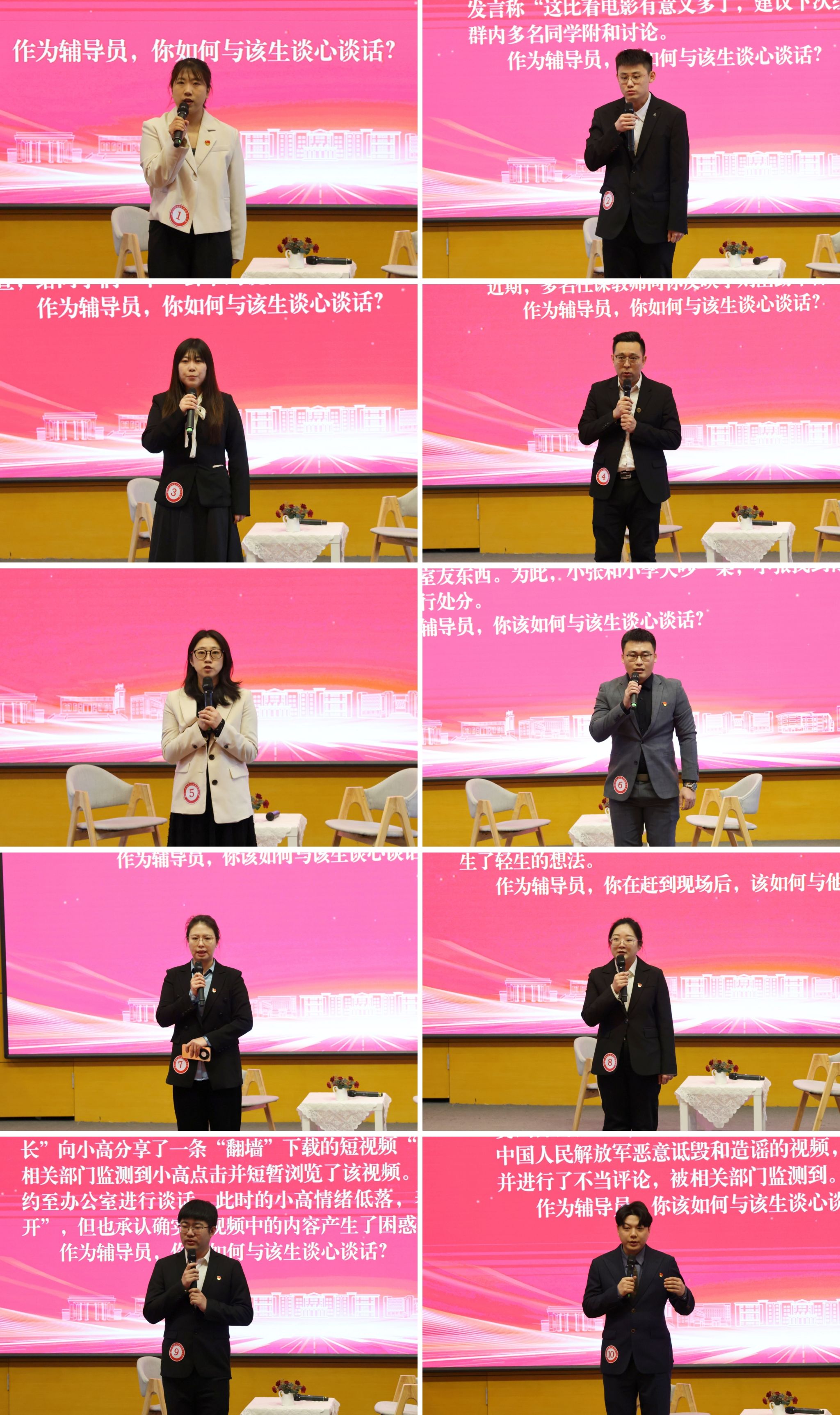 本次大赛历经初赛、复赛、决赛三个阶段。初赛和复赛面向全体辅导员,设置基础知识测试、学情分析、案例研讨、谈心谈话等环节,全面检验辅导员的理论储备、政策把握能力和日常事务处理水平。经过层层选拔,10名辅导员脱颖而出,晋级决赛。