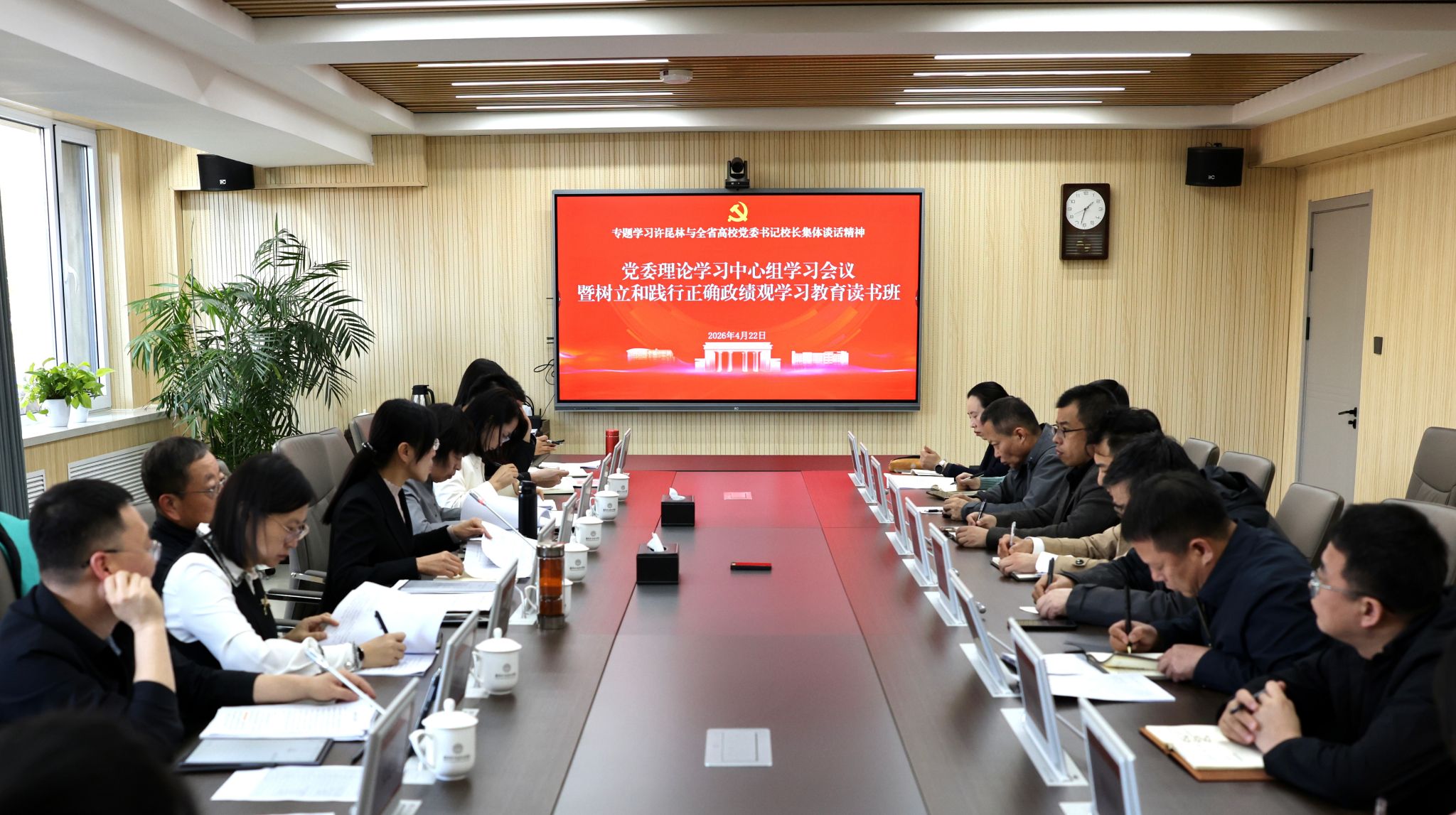 4月22日,学校在守正楼105会议室召开党委理论学习中心组学习(扩大)会议暨树立和践行正确政绩观学习教育读书班,传达学习省委书记许昆林与全省高校党委书记校长集体谈话精神,省委副书记、省长王新伟在全省高校党委书记校长政治能力提升专题培训班开班式上的动员讲话精神。党委书记张晓雁主持会议,学校领导、党委委员出席会议,有关部门负责人列席会议。
