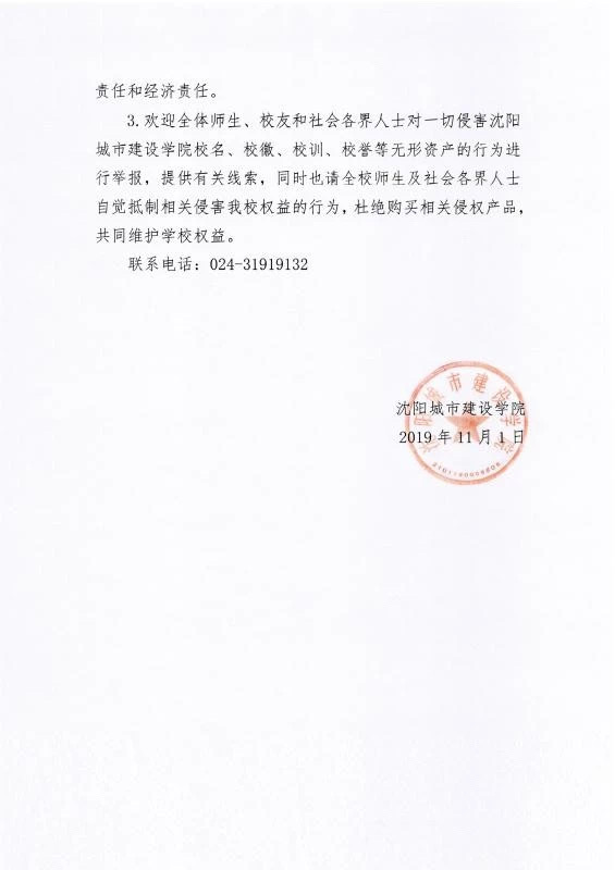 关于维护沈阳城市建设学院校名、校徽、校训等无形资产声明