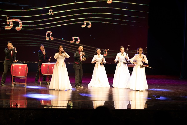 演出在器乐合奏《茉莉花》中拉开帷幕。这首广为传颂的中国民歌,完美的呈现了中国传统文化艺术的魅力。琵琶独奏《阳春白雪》表现了“取万物知春,风淡荡之意。凛然清洁,雪竹琳琅之音。”合奏《春江花月夜》用音符勾勒出春夜美景。合奏《翻身的日子》、《在那遥远的地方》、《新贵妃醉酒》、《忆》等一曲曲动人的旋律在音乐厅上方久久回荡。二胡齐奏《战马奔腾》,荡气回肠,气势恢宏。唢呐独奏《百鸟朝凤》和《打枣》,热情奔放的旋律,让全场观众都变得欢快怡然。器乐奏唱《三生三世十里桃花》更是将全场演出推向了高潮。