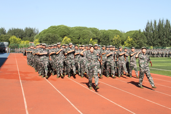 大会在庄严的国歌声中拉开帷幕,鲜艳的五星红旗冉冉升起,高高飘扬在体育场上空。院长温景文检阅了军训方阵。各个方队踏着《分列式进行曲》的激昂旋律,迈着铿锵有力的步伐依次走过主席台,进行分列式汇报表演。随后,二营(土木工程系)擒敌拳方阵、六营(管理系)女子匕首操方阵、八营(应用科技学院)军体拳方阵进行了汇报展示。