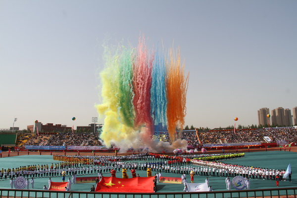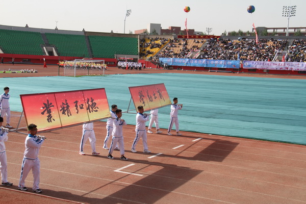 伴随着激昂的《运动员进行曲》,护旗队、花束队、彩旗队、裁判员代表队依次走过主席台。十余个方队依次入场,接受大会检阅。各系代表队的入场形式多样,精彩纷呈。有的拼出盛开的花朵,有的亮出响亮的标语,有的展示专业建设成果,有的呈现特色工作亮点。留学生院代表队更是将本国文化与体育运动结合,让整个检阅式更加多样化、国际化。最终所有方队在体育场中央组成了一个巨大的五角星图案,象征着城建师生的昂扬向上的风貌,诠释出本届运动会“更高,更快,更强”的奥林匹克精神。