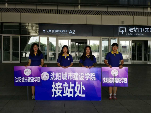 8月26日一早,在人头攒动的沈阳站、沈阳南站和沈阳北站,出站口不远处,紫底白字的“沈阳城市建设学院”接站标牌显眼注目,陆续到达的新生们来到标牌前询问乘坐事宜。在带领新生达到校车乘坐点之后,再返回等候下一班火车的到来。