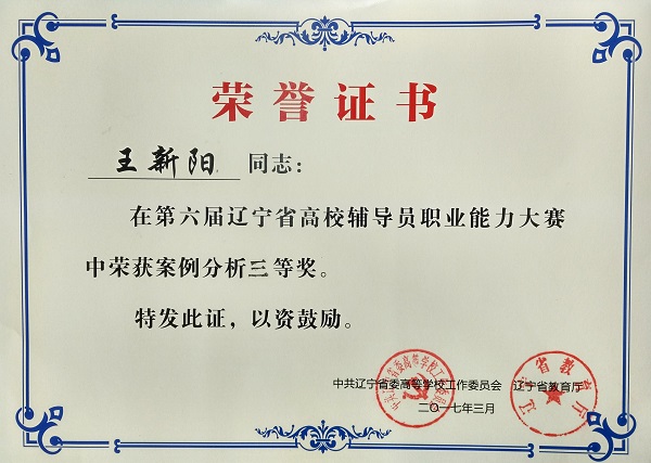 3月29至30日,由中共辽宁省委高校工委、辽宁省教育厅主办、全国高校辅导员发展研究中心(大连海事大学)承办、辽宁省大学生在线联盟网站协办的第六届辽宁省高校辅导员能力大赛在大连落下帷幕。我校交通与机械工程系辅导员王新阳在比赛中获得案例分析个人三等奖;我校喜获“优秀组织奖”。
