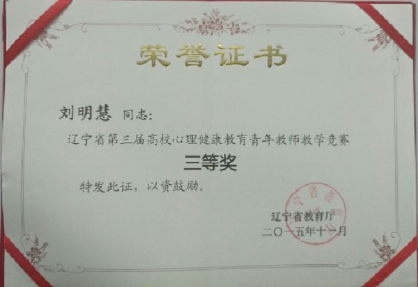 近日,辽宁省第四届高校心理健康教育青年教师教学竞赛圆满落幕。全省38所心理健康教育示范校负责人及其师生代表共178人参加了本次活动,我校学生处大学生心理咨询室教师郎姝荣获三等奖。这是继2015年刘明慧老师获奖后,我校再次获得此项荣誉。