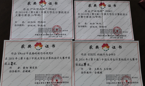近日,2016年(第九届)中国大学生计算机设计大赛进行了现场决赛,我校信息与控制工程系共有四组学生入围全国总决赛。由金媛媛老师带队的两组学生参加了在厦门理工大学进行的动漫游戏/微课类决赛;由郭莉莉老师带队的两组学生在上海华东师范大学进行了软件应用与开发类总决赛。其中,徐秋媛、邢逸玲的作品《“筑梦众筹”网站》荣获网站设计类全国二等奖;张浩、陈东的作品《“爱嘻游”网站》荣获网站设计类全国三等奖;董旭、樊家辰的作品《Word中表格的制作与使用》和王新志、王世钢的作品《EXCEL的统计与分析》均荣获微课类全国三等奖。