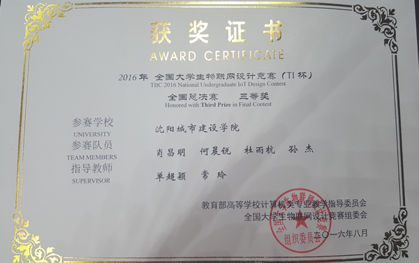 近日,2016年全国大学生物联网设计竞赛(TI杯)总决赛于西安交通大学举办,我校由信息与控制工程系常玲老师带队,单超颖与常玲任指导教师,肖昌明、孙杰、杜雨杭、何晨锐4名学生组成的代表队同东北大学、武汉大学、西安交通大学、北京理工大学、四川大学、上海交通大学等高校同台竞技,最终荣获“全国总决赛三等奖”的优异成绩。