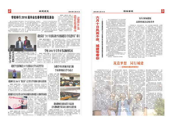 《沈阳城市建设学院报》由学校党委主办,每月一期。校报内设“要闻城建”、“城建速览”、“青青校园”等版面,校报以精美的设计、大方的排版、精炼的语言和优美的文字赢得了师生的肯定。校报的创办进一步加强了学校的思想阵地建设,在弘扬社会主义核心价值观,引导学生成长成才等方面将发挥积极作用。校报是一个大舞台,是每一位师生文字的好归属,它不仅将学校丰富多彩的校园文化呈现出来,更是为学生提供了展现自我的平台。作为学校大事小情的集散地,校报编辑部将立足学校实际,和校园网、新媒体、广播电视台一起构建立体宣传媒介,说城建事、传城建情,在这个充满墨香的平台上与全体城建师生更好地演绎城建的交响。(通讯员:邓晶晶)