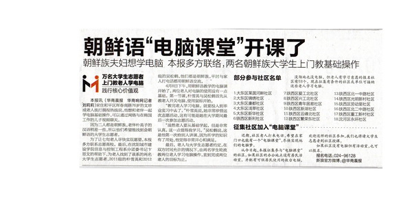 朝鲜语“电脑课堂”开课了!近日,我校的两名朝鲜族志愿者朴雪英和吴松鹤来到和平区76岁朝鲜族老人文珍成家中,教老人用电脑。