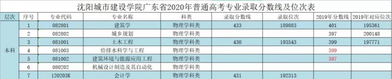 B、沈阳城市建设学院广东省2020年普通高考专业录取分数线及位次表