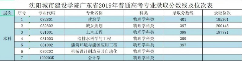 A、沈阳城市建设学院广东省2019年普通高考专业录取分数线及位次表