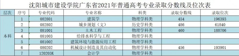 C、沈阳城市建设学院广东省2021年普通高考专业录取分数线及位次表
