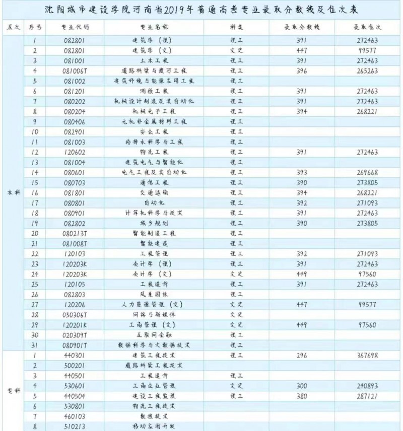 A、沈阳城市建设学院河南省2019年普通高考专业录取分数线及位次表