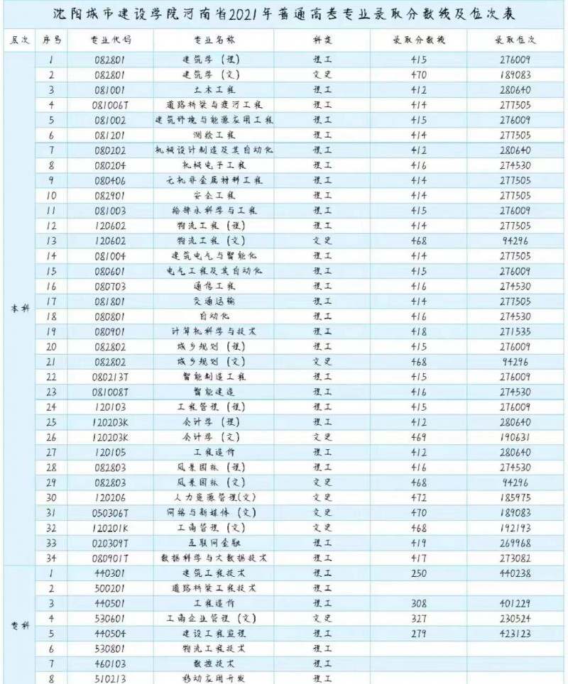 C、沈阳城市建设学院河南省2021年普通高考专业录取分数线及位次表