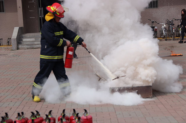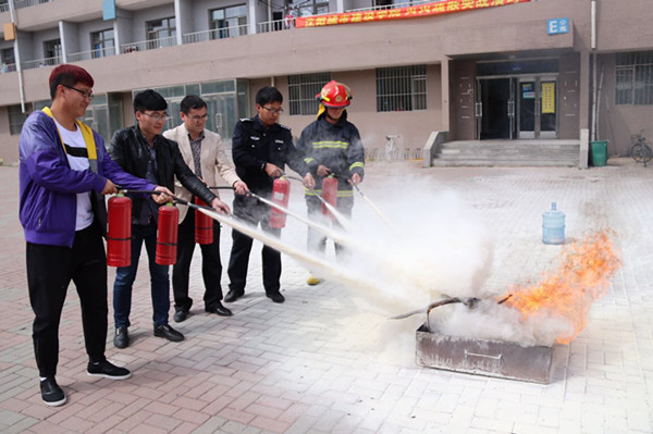 随后,消防官兵现场讲演了灭火器的使用方法及逃生绳的打结方法,现场十五名学生代表、三名教师代表参与了实战灭火。