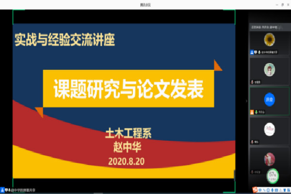 为提高教师课题研究质量和论文写作水平,8月20日,土木工程系召开了“课题研究与论文发表—实战与经验交流”讲座。讲座采用线上远程形式,主讲人为系副主任赵中华教授,讲座由系副主任齐庆会教授主持,校级教改课题、校级精品课、重点课负责人以及相关教师共40人参加了讲座。