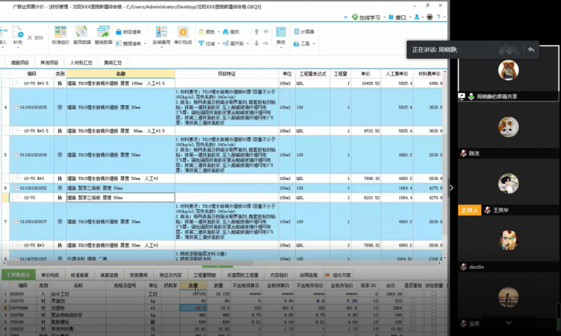 培训中,周晓静利用一套完整的实际工程项目计价文件讲解了工程计价的流程及注意事项,包括分部分项工程费、措施项目费、其他项目费以及规费税金的计取。在分部分项工程量清单及措施项目清单计价中,她着重讲解了重要项目的选取定额方法、人工费、材料费的调整、定额系数换算以及某些特殊项目的含量调整等。为方便学生理解,还特别介绍了部分项目的施工工艺、实际工程中的常规做法,并与学生们分享了个人经验数据。同时,她还指出了计价时需要注意的细节问题,避免清单列项时漏项。在其他项目清单与规费清单计价中,她针对“招标控制价”和“商务标”两个毕业设计方向,讲解了招标控制价与投标报价的计价差异,并对这两个毕业设计方向的学生分别给出了指导性建议。