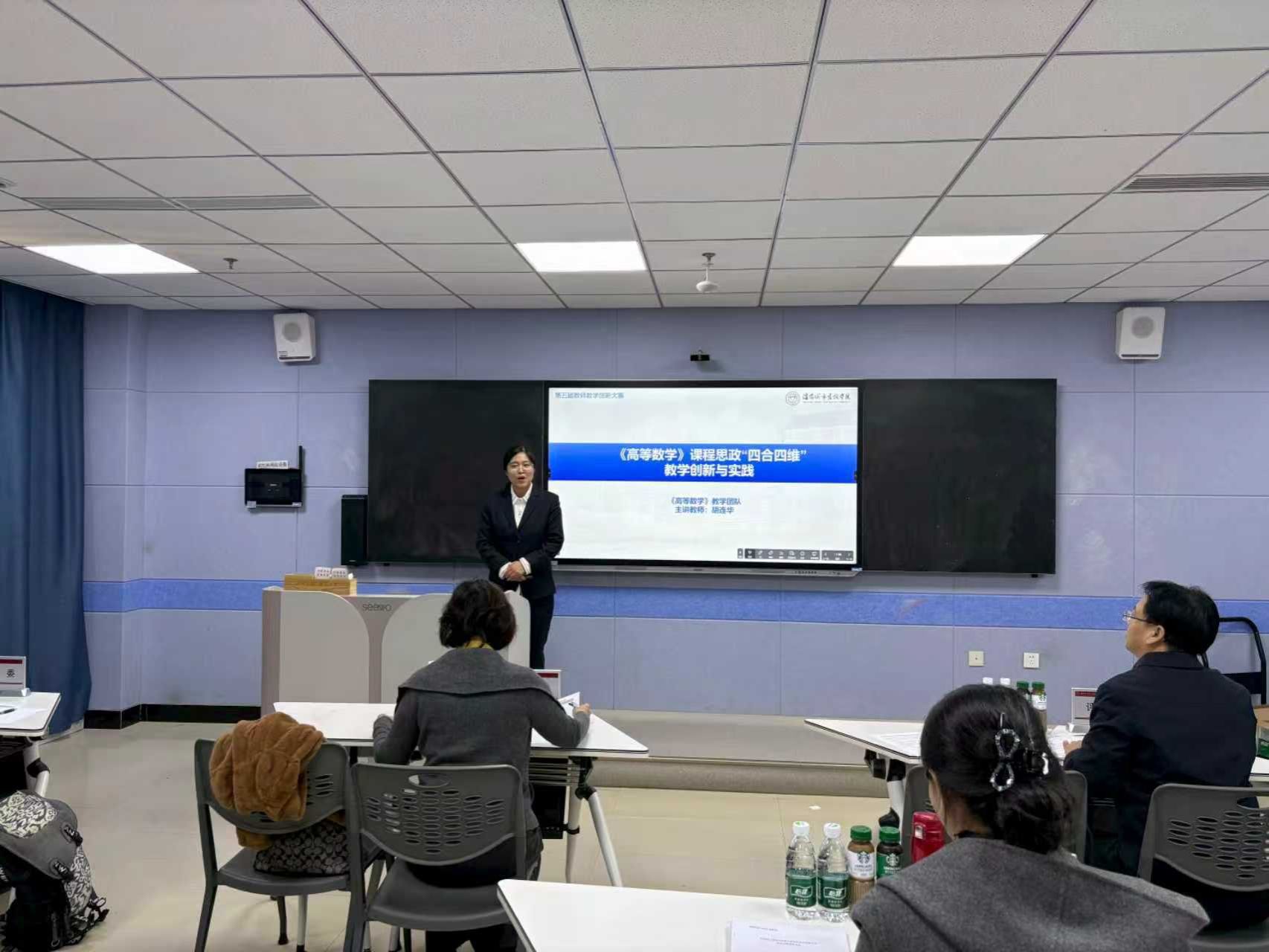 决赛现场,参赛教师按抽签顺序依次登台,以饱满的教学热忱、扎实的专业素养展现教学创新风采。各位教师紧密结合所属学科专业特色,精准研判课堂教学中的痛点难点,通过12分钟的教学设计创新汇报,系统呈现教学理念与目标设定、教学内容剖析、学情分析、课程思政融入、教学过程与方法创新等核心内容,将价值塑造、知识传授与能力培养三者有机融合,实现课程思政元素与教学全流程的无缝衔接。其中,产教融合组教师重点展示了产教融合课程的合作模式构建思路与成果转化路径,生动诠释了我校教师精湛的课堂教学功底与“以学生为中心”的教学创新理念。