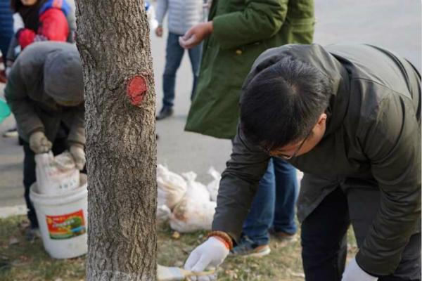 活动初始,机关第二党支部书记介绍了此次活动出席人员及学子林公益活动的目的和意义,讲解了活动具体内容。此次活动分为校园环境卫生清扫和学子林树木刷漆两部分。在后勤集团工作人员的帮助和指导下,参与活动人员热情高涨,克服寒冷天气,佩戴手套,分发木刷和桶漆,满载爱心与责任,积极的参与到冬季树木防护和校园环境卫生清扫活动中去。