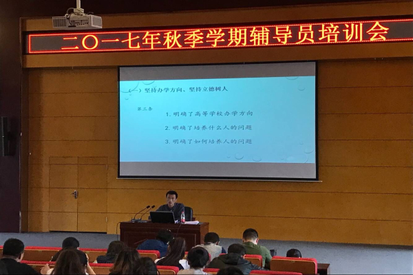 为贯彻落实习近平总书记在全国高校思想政治工作会议上的重要讲话精神,进一步提升全校辅导员的综合素质和业务能力,9月6日,学生处在国际交流中心306报告厅举办辅导员工作培训会。副校长李厚艳、各系主管学生工作副主任、全体辅导员参加此次培训。学生处处长张猛主持培训会并担任主讲。