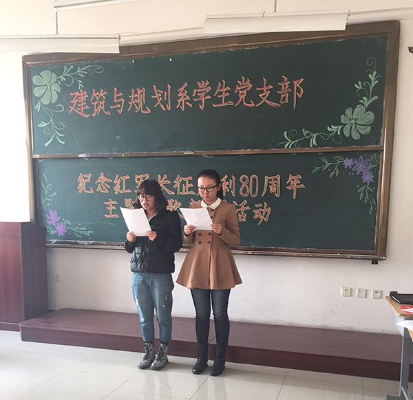 为大力弘扬长征精神,缅怀革命先烈的丰功伟绩,10月25日下午,建筑与规划系学生党支部在第二教学楼519教室举行纪念“红军长征胜利80周年”诗歌朗诵活动。系党总支书记、全体学生党员和积极分子代表参加了此次活动。
