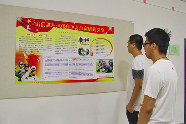 重宣传。建筑系通过组织学生关注“沈阳征兵”微信公众平台、在第二教学楼及寝室公告栏张贴宣传海报、悬挂条幅等形式进行征兵宣传,努力营造“当兵光荣、当兵受益、当兵成才”的浓厚舆论氛围。