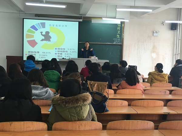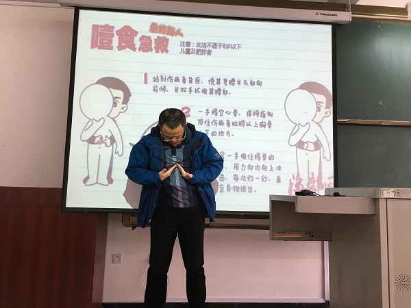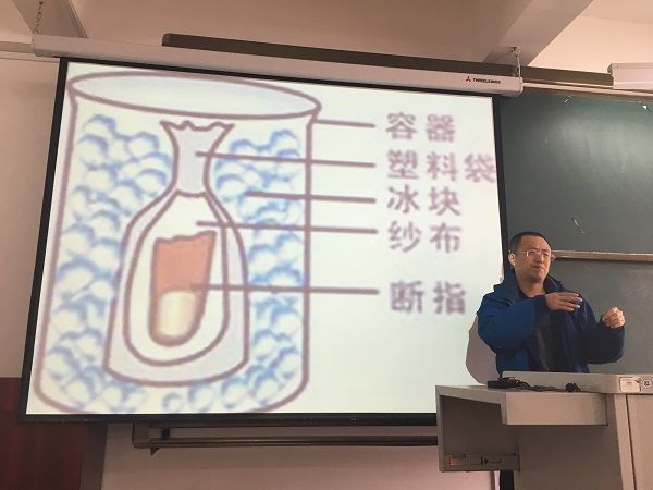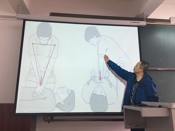 杨林以实用简单为主要思路,从常见的急症的类型、急症的应急处理方法以及急症的相关预防三方面进行讲解。在讲授过程中,他通过图片、生活实例以及现场急救方法演示为与会教师呈现了一场别开生面的讲座。同时,杨林还将自己从医近二十年的生活感悟与会教师分享,他认为为人要以积极乐观的心态面对生活,要怀有一颗感恩的心,对待任何问题要用微笑来积极应对,保持自身的心理健康,从而促进身体上的健康。